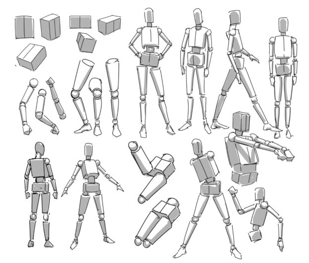 В качестве основных форм используйте кубы и цилиндры. Первые подойдут для крупных частей тела — головы, грудной клетки и таза.