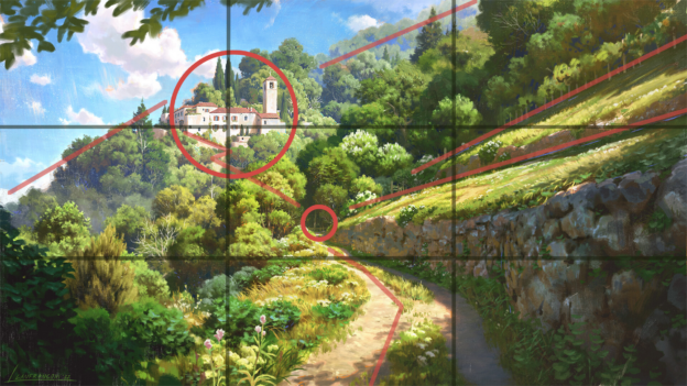 Основой служит упрощенное правило золотого сечения. Оно заключается в том, что художник проводит линии, которые делят холст на 9 одинаковых частей. Места пересечения линий сетки подойдут для размещения фокусных точек. При этом важно соблюдать иерархию — должен быть главный объект и второстепенный. Не стоит пытаться разместить на каждой точке что-то интересное, поскольку это помешает концентрации внимания и будет перегружать рисунок.