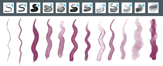 Случайность даёт возможность добавлять текстуру в мазок наподобие шума. Чем меньше значение этого параметра, тем плотнее будет кисть.