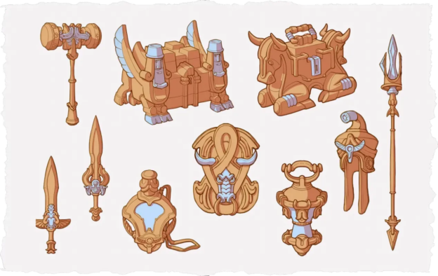 После проработки базовых форм и композиции можно перейти к построению реальных предметов. Выбирайте простые — например, предметы вроде мечей, топоров, свитка и так далее.