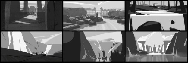 Чтобы создать кадр, который зритель сможет быстро «прочитать», не стоит сразу думать о конкретных элементах (персонажах, мебели, камнях, деревьях), которые вам нужно расставить в кадре. Начните с базовых четких и читаемых пятен (как в миниатюрах возле каждого из кадров), а уже затем ищите в них свои элементы.