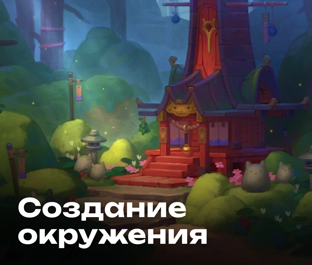 Ты изучишь процесс создания игровой локации и научишься на базовом уровне работать с цветом, атмосферой. А еще создавать дневное и ночное освещение. На курсе ты нарисуешь стилизованный пейзаж с архитектурным объектом.